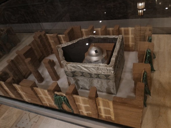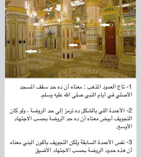 “Ruang itu sebagian besar tertutup kain tenunan yang terbuat dari sutra murni, berwarna hijau lembut dengan kain katun yang kuat, dan dimahkotai oleh sabuk yang mirip dengan penutup Ka’bah, tetapi ini berwarna merah. Seperempat bagian dari kain dibordir bertuliskan ayat Al-Qur’an yang mulia dari suroh al-Fath, terbuat dari garis kapas dan benang emas dan perak..”