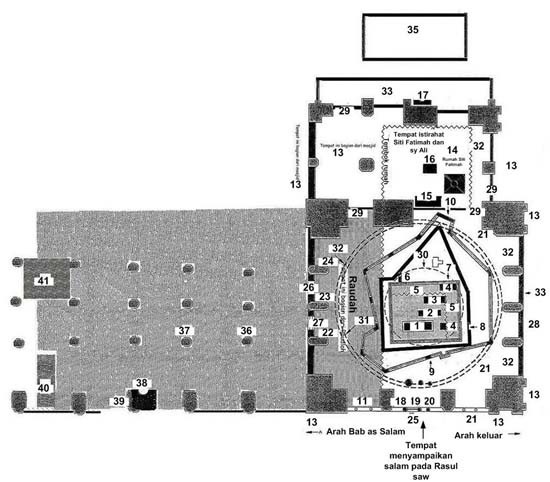 Kami didampingi kepala Suku Aghwaat (juru kunci dan penjaga makam Nabi turun-temurun). Kami menggunakan bahasa isyarat dan kalau terpaksa berbicara akan kami lakukan dengan berbisik-bisik. Aku, yang pada waktu itu mataku sudah lemah dan kacamata ini tidak pernah meninggalkan mataku sejak bertahun-tahun sebelumnya, tapi di ruang itu aku berubah menjadi orang lain, sungguh aku merasakan hal itu, dan perbedaan itu sangat jelas bagiku.”