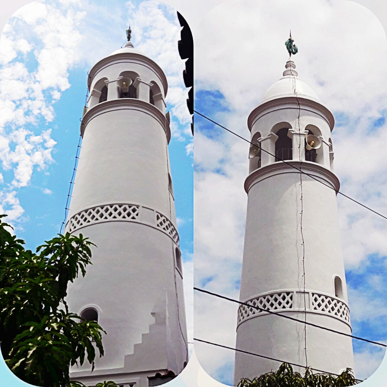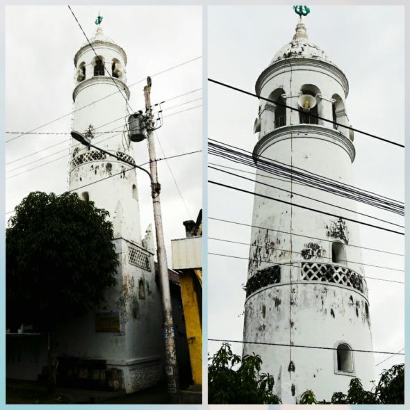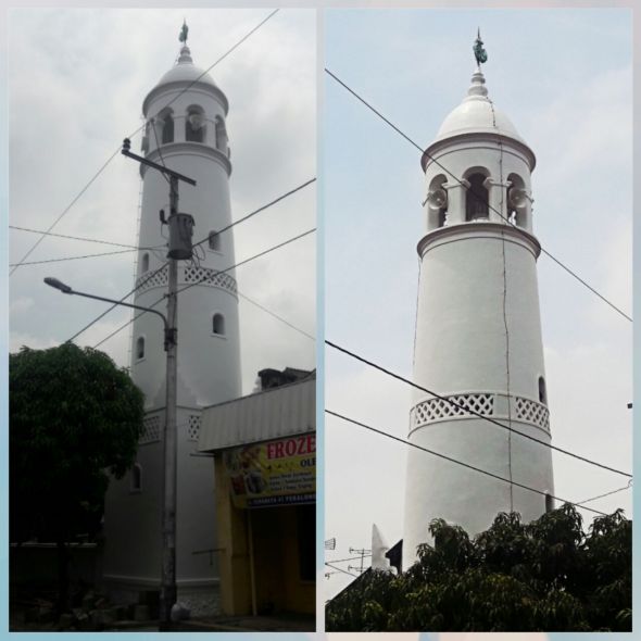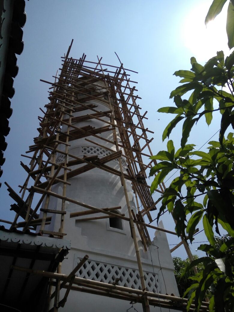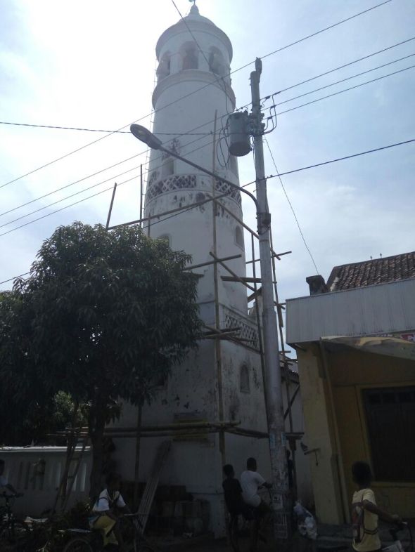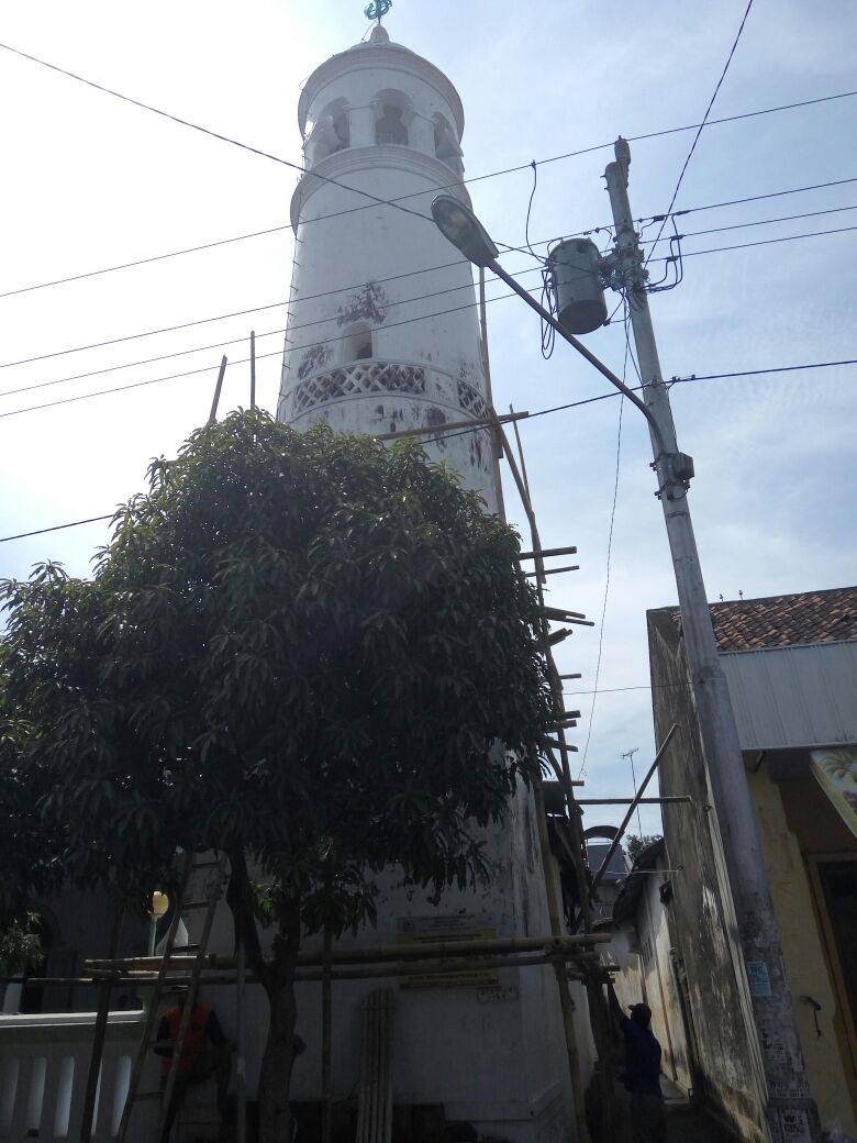 Saat ini sedang dilakukan renovasi dan pengecatan menara masjid Wakaf Pekalongan jalan Surabaya.