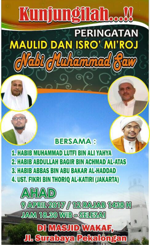 Masjid Wakaf Pekalongan menyelenggarakan Maulid dan Isro’ Mi’raj Nabi Muhammad saw. yang dihadiri oleh para habaaib, ulama dan masyarakat Pekalongan.